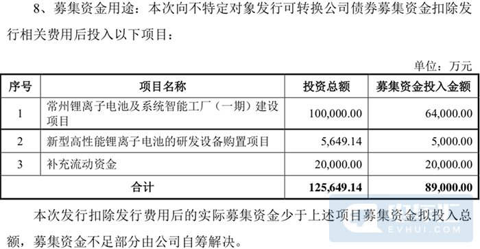 11月4日,鹏辉能源正式发布《向不特定对象发行可转换公司债券》上市公告书,拟发行890万张债券,100元/张,共募资8.9亿元,除用来补充流动资金的2亿元之外,其中5000万将投入新型高性能锂离子电池的研发设备购置项目,其余6.4亿将全部投入常州锂离子电池及系统智能工厂(一期)建设项目。
