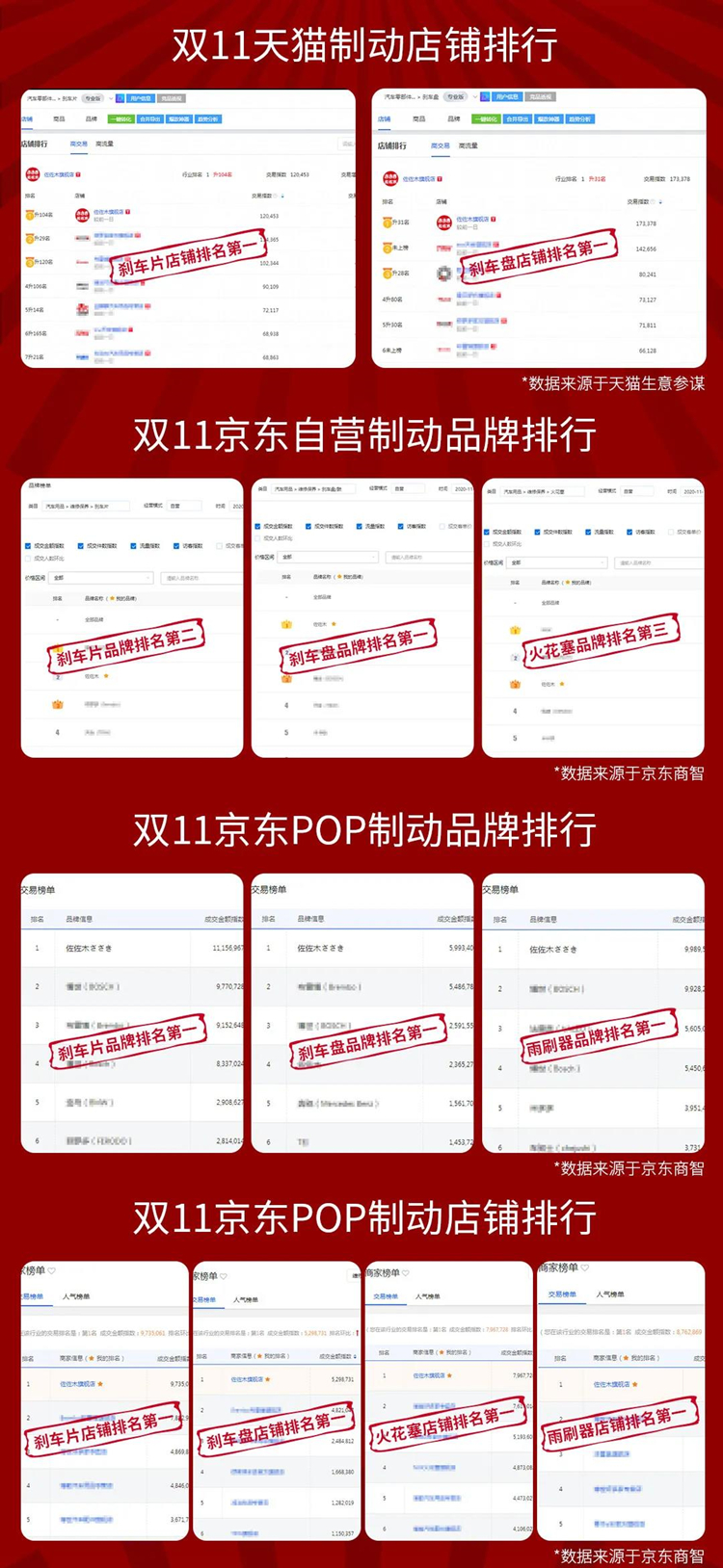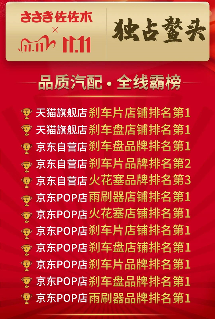 京东佐佐木品牌刹车盘、刹车片、雨刷销量第一,火花塞第三