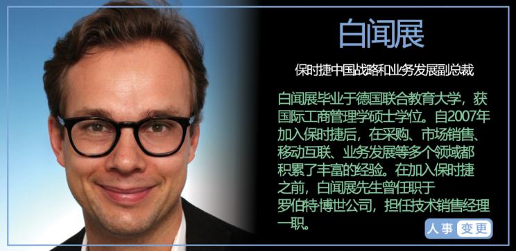 白闻展先生毕业于德国联合教育大学,获国际工商管理学硕士学位。自2007年加入保时捷以来,在采购、市场销售、移动互联、业务发展等多个领域都积累了丰富的经验,是精通技术与管理的综合型人才。在加入保时捷之前,白闻展先生曾任职于罗伯特·博世公司(Robert Bosch GmbH),担任技术销售经理一职。