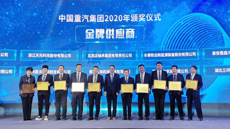中国重汽集团总经理蔡东(中)为张晓平董事长(右五)等“金牌供应商“获奖供应商代表颁奖