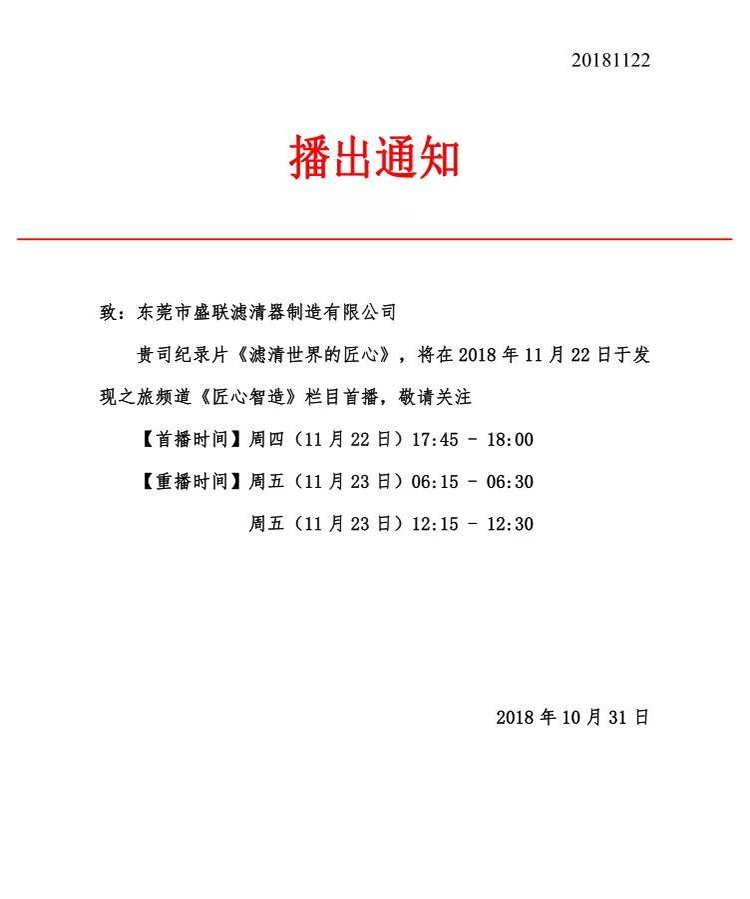 CCTV-9发现之旅《匠心智造》栏目为盛联倾情打造的纪录片《滤清世界的匠心》将于2018年11月22日首播!