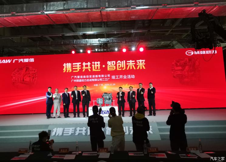 12月29日,广汽爱信自动变速器有限公司和广州祺盛动力总成有限公司二工厂正式竣工开业,竣工开业活动在广汽爱信工厂内举行,活动主题为“携手共进·智创未来”。广州祺盛动力总成有限公司二工厂投产后,将生产广汽传祺钜浪动力发动机产品序列下的1.5TM、1.0TGDI、2.0TM和1.5TG等机型。