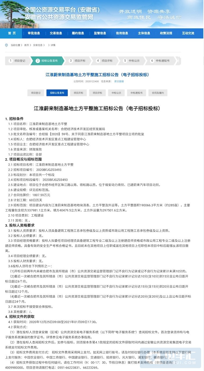 近日,安徽合肥公共资源交易中心发布“江淮蔚来制造基地土方平整”的招标公告,招标文件显示,项目位于合肥市经开区珠江路以南、宿松路以西,位于熔安动力南侧、已建蔚来汽车项目北侧。2021年1月15日开始招标,预计60日完成土方平整工作。