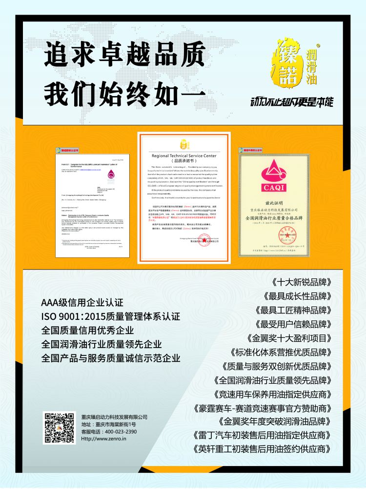 2017年度中国润滑油品牌TOP100评比中,臻诺zenro润滑油凭借精益求精的制造精神,获得了《最具工匠精神品牌》的殊荣。凭借在西北、中南、西南、华南区域市场的卓越表现,获得《最具成长性品牌》的殊荣。