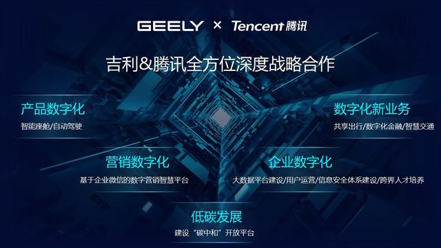 1月19日,吉利汽车集团与腾讯在杭州签署战略合作协议,围绕智能座舱、自动驾驶、数字化营销、数字化底座、数字化新业务及低碳发展等领域展开全方位战略合作。