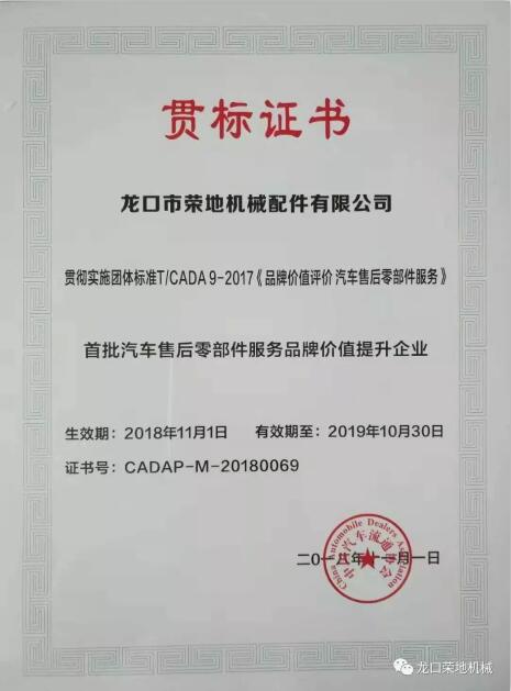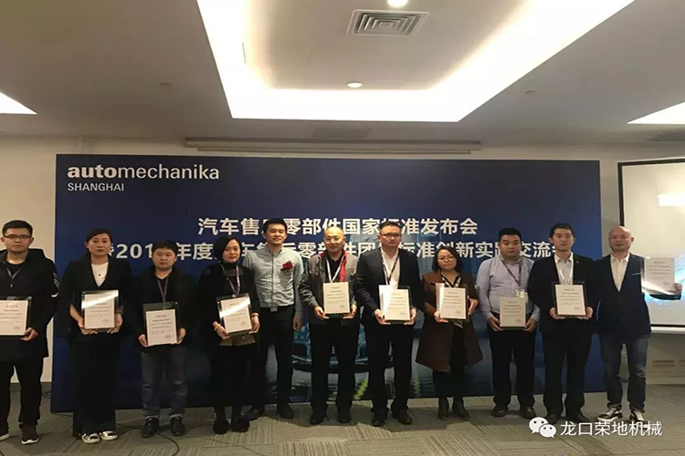 11月29日,由中国汽车流通协会主办的“汽车售后零部件国家标准发布会暨2018年度汽车售后零部件团体标准实施创新实践交流会”在上海国家会展中心成功召开。龙口市荣地机械配件有限公司应邀参加本次会议,并获得了《首批汽车售后零部件服务品牌价值提升企业》荣誉。