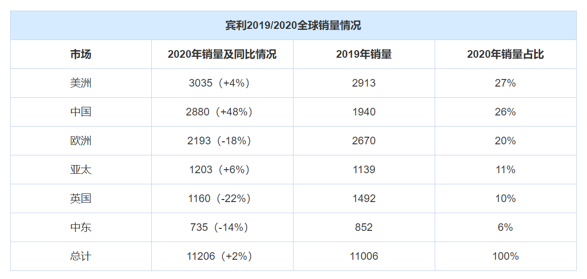 由于新冠肺炎疫情影响,宾利英国总部工厂曾于2020年3月起暂停生产七周,但总的来看,其在2020年交出了较好的销量答卷,而中国市场的贡献不可小觑。根据此前的消息,宾利计划于2021年发布9款新车,这意味着我们将在今年看到宾利更多更好的表现。