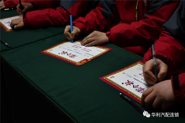 整车销售版块、加盟连锁销售中心、终端直营版块、油水/曼博项目部、 业务职能版块、行政物流版块分别签订军令状。