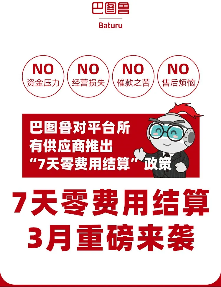 据了解,巴图鲁“7天零费用结算”政策将在3月份全面推行。该政策面向平台所有供应商开放,这意味着只要是和巴图鲁合作的汽配商家,不需要支付额外费用,在所有订单成交后,巴图鲁会以“T+7”原则与其进行货款结算,货款到达供应商指定账户后,可自由提取。