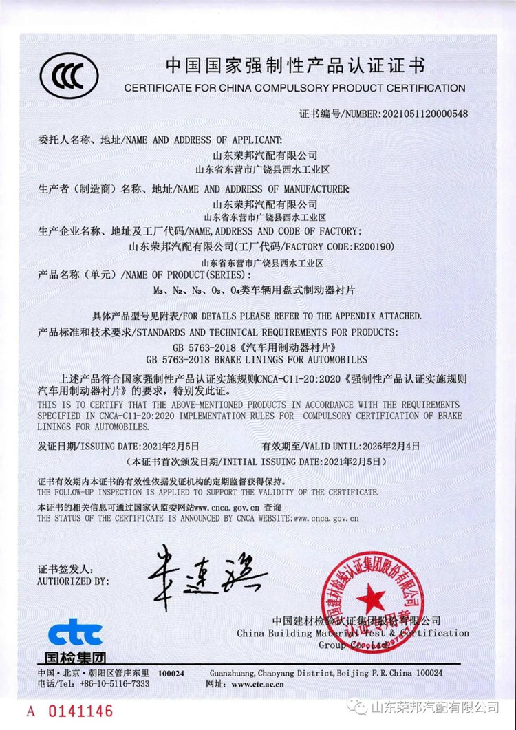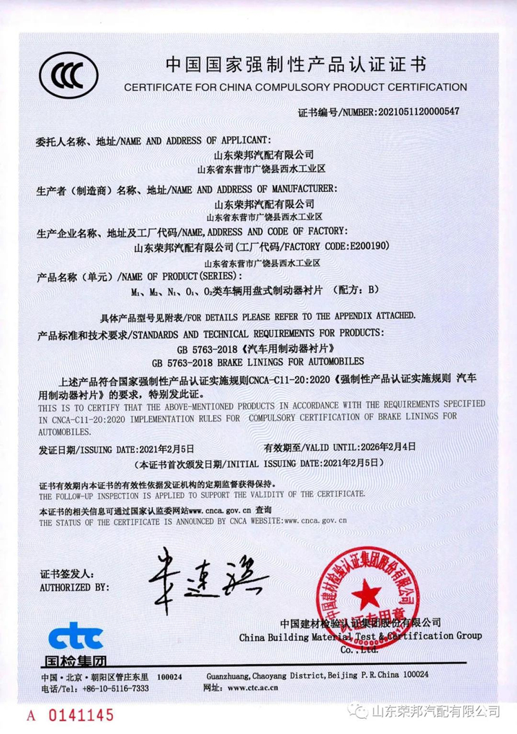 国家市场监督管理总局于2020年4月20日颁布了《市场监管总局关于汽车用制动器衬片产品由生产许可转为强制性产品认证管理实施要求的公告》。根据市场监管总局的要求,自2020年6月1日起,汽车用制动器衬片纳入CCC认证管理范围。自2021年6月1日起,汽车用制动器衬片产品未获得强制性产品认证证书和未标注强制性认证标志的,不得出厂、销售、进口或在其他经营活动中使用。