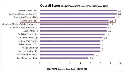 相比其他测试轮胎,锦湖ECSTA HS51燃油经济性能表现抢眼。最终以6.8分的总成绩获得“满意等级”的评价,在15款轮胎排名中斩获第四名。