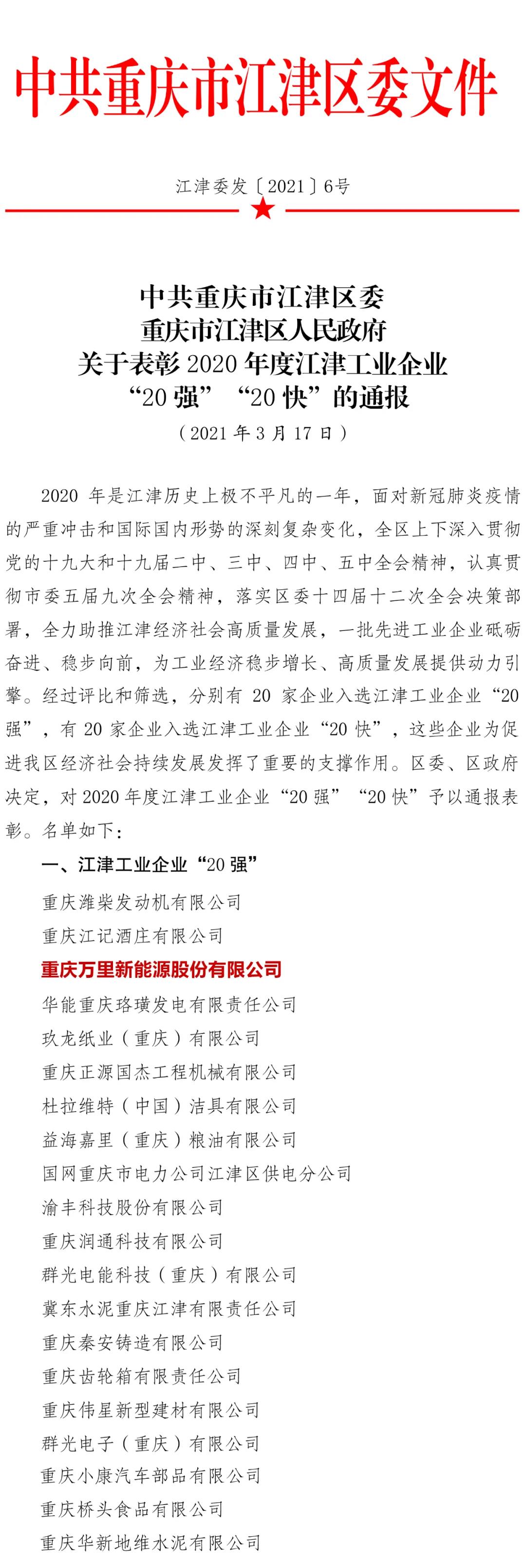重庆万里新能源股份有限公司在2020年深入贯彻习近平新时代中国特色社会主义思想和党的十九大及十九届二中、三中、四中、五中全会精神,自觉践行新发展理念,深入贯彻区委、区政府决策部署下,全力推动万里高质量发展。万里公司通过认真学习和深入贯彻成功的迈上了新台阶、呈现了新气象。并获得了区各级领导对我公司的积极肯定,通过区委,区政府的筛选,评比重庆万里新能源股份有限公司再次荣获了“江津工业企业20强”荣誉称号。