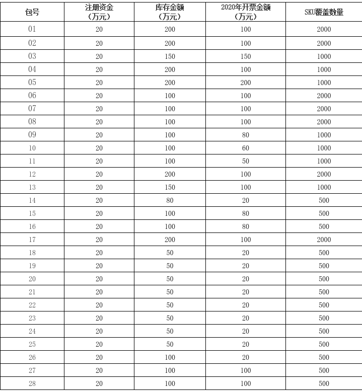 2、各项目包对于注册资金、库存金额、年开票金额、SKU覆盖数量等最低资格要求如下: