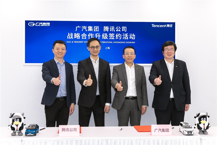 2021年4月19日上海车展媒体日当天,广州汽车集团股份有限公司(以下简称“广汽集团”)与深圳市腾讯计算机系统有限公司(以下简称“腾讯”)在上海举行战略合作升级签约活动。在广汽集团总经理冯兴亚、腾讯高级执行副总裁汤道生见证下,广汽集团常务副总经理吴松、腾讯副总裁钟翔平代表双方签约。