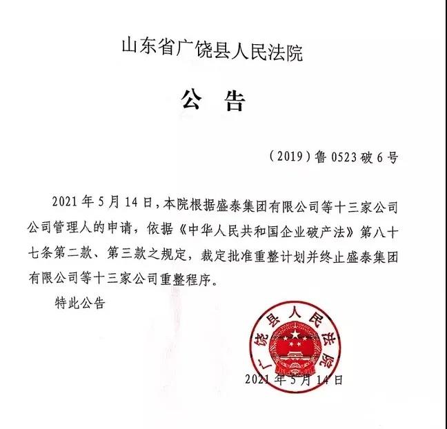 经山东省广饶县人民法院裁定,批准盛泰集团等13家公司合并重整计划草案,并终止重整程序。