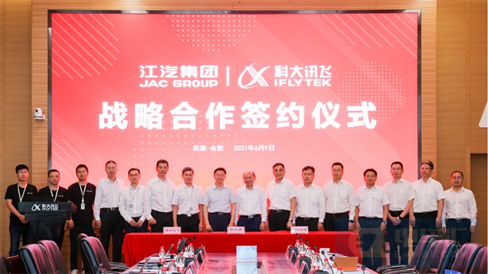 6月9日,科大讯飞股份有限公司(简称“科大讯飞”)与安徽江淮汽车集团股份有限公司(简称“江淮汽车”)在合肥签署了战略合作框架协议,科大讯飞董事长刘庆峰,江淮汽车党委书记、董事长项兴初及双方集团公司的高管出席了签约仪式。