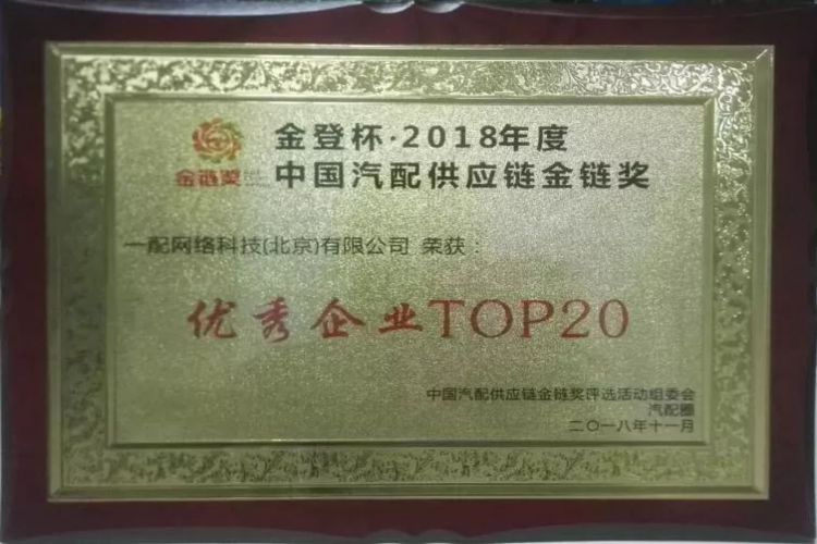 此次颁奖盛典共设为七大奖项,上百家企业参与评选投票,经过一周时间的拼杀,一配网络科技(北京)有限公司凭借自身实力、品牌影响力在众多参评企业中杀出重围,获得“金登杯•2018年度中国汽配供应链金链奖——优秀企业TOP20”殊荣。