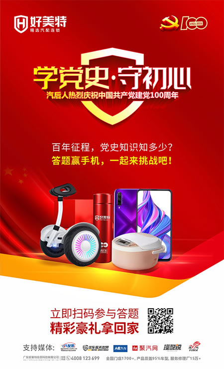 “欲知大道,必先为史。”党史蕴含着生生不息的思想力量、文化基因和精神动能。好美特精选汽配连锁联合聚汽网、汽配说、汽车服务世界、AC汽车、汽配圈、一马传媒等汽后各大权威媒体,推出“学党史·守初心”知识答题活动,借此增进新时代汽后人对党史的了解,从历史中获得启迪,激励汽后人发扬和传承革命精神,共创汽后行业新篇章!