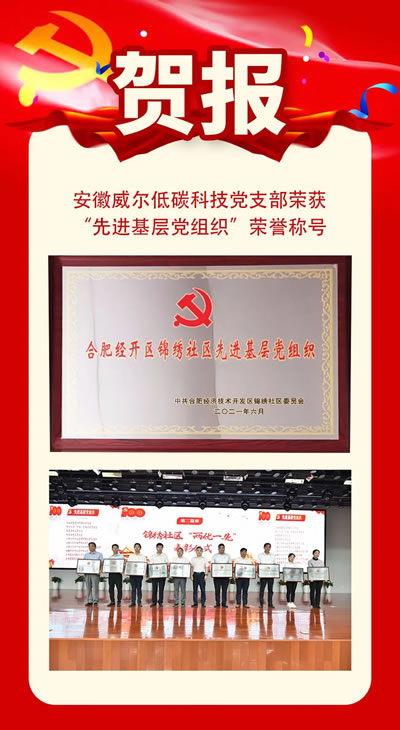 在中国共产党建党100周年之际,安徽威尔低碳科技股份有限公司党支部荣获”合肥经开区锦绣社区先进基层党组织”荣誉称号。