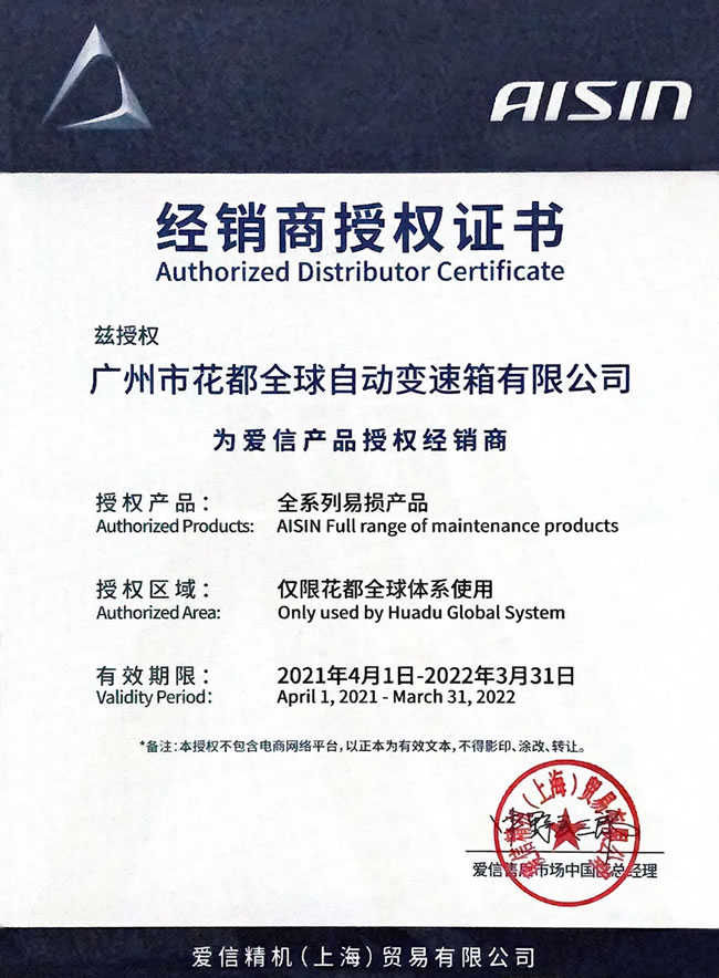 2021年6月,广州市花都全球自动变速箱有限公司(以下简称:花都全球)荣获爱信精机全系列易损产品授权经销商,本授权是专门针对全球公司及集团内各分公司的集体授权,这是爱信精机对花都全球公司的信任,也是对花都全球公司销售能力的肯定。花都全球与爱信精机在激烈的市场竞争中强强联合,优化资源配置,提高服务效率,得到了市场和用户的信任。