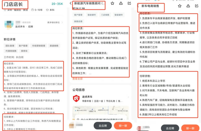 另外,《新车新技术》发现,途虎已经在猎聘、BOSS直聘等招聘平台上发布了多个新能源汽车业务相关岗位的招聘信息,具体包括商务、门店店长、线上销售和线下销售顾问等岗位,工作地点有广州清远、深圳、四川成都等地。