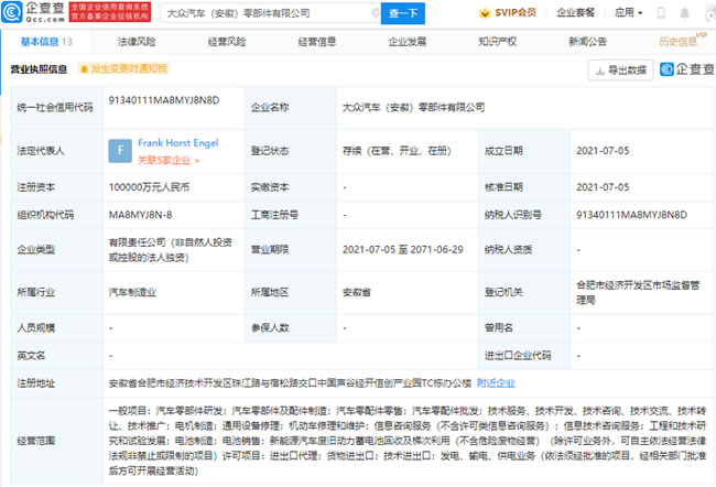 大众汽车(安徽)零部件有限公司信息;图片来源:企查查