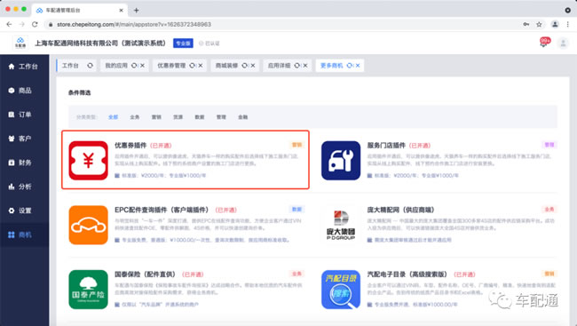 左侧导航“商机—更多商机“,找到《优惠券》插件,付费开通