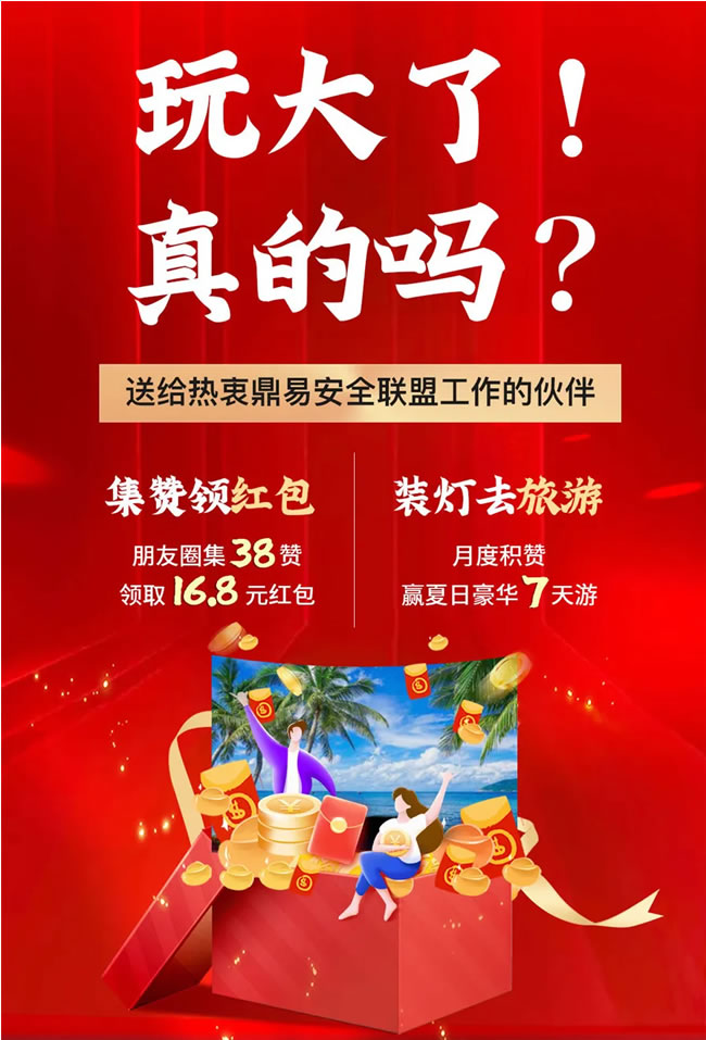 据了解,此次活动除了旅游大奖,鼎易安全联盟终端门店的伙伴们,每天装灯都有机会能赢取价值16.8元的集赞现金红包,全国范围内这么多的终端兄弟门店,红包回馈、旅游激励也有需要一笔不菲的支出,是什么让您决定重金开展此次品牌活动?
