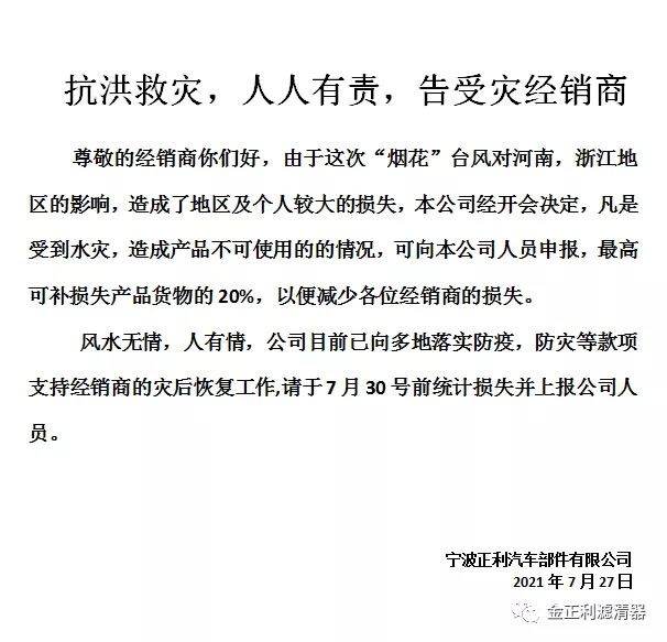 尊敬的经销商你们好,由于这次“烟花”台风对河南,浙江地区的影响,造成了地区及个人较大的损失,本公司经开会决定,凡是受到水灾,造成产品不可使用的的情况,可向本公司人员申报,最高可补损失产品货物的20%,以便减少各位经销商的损失。