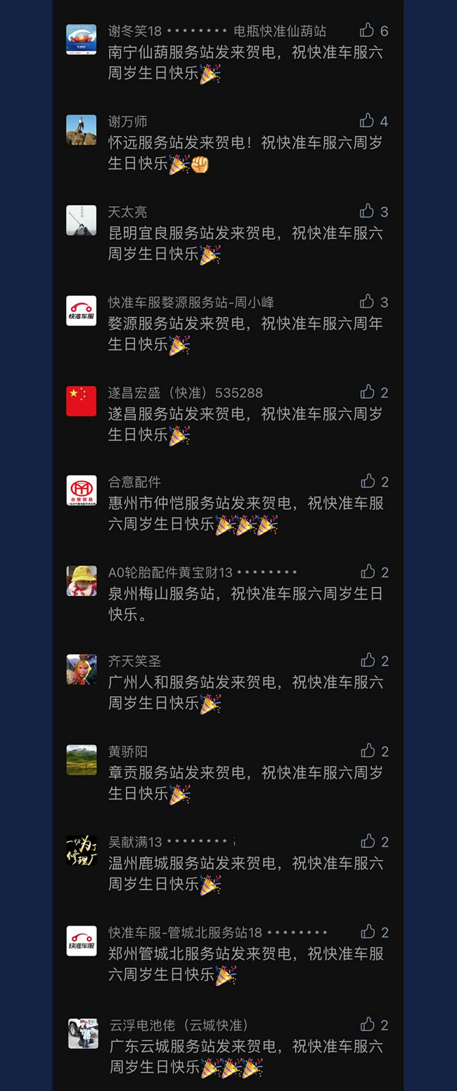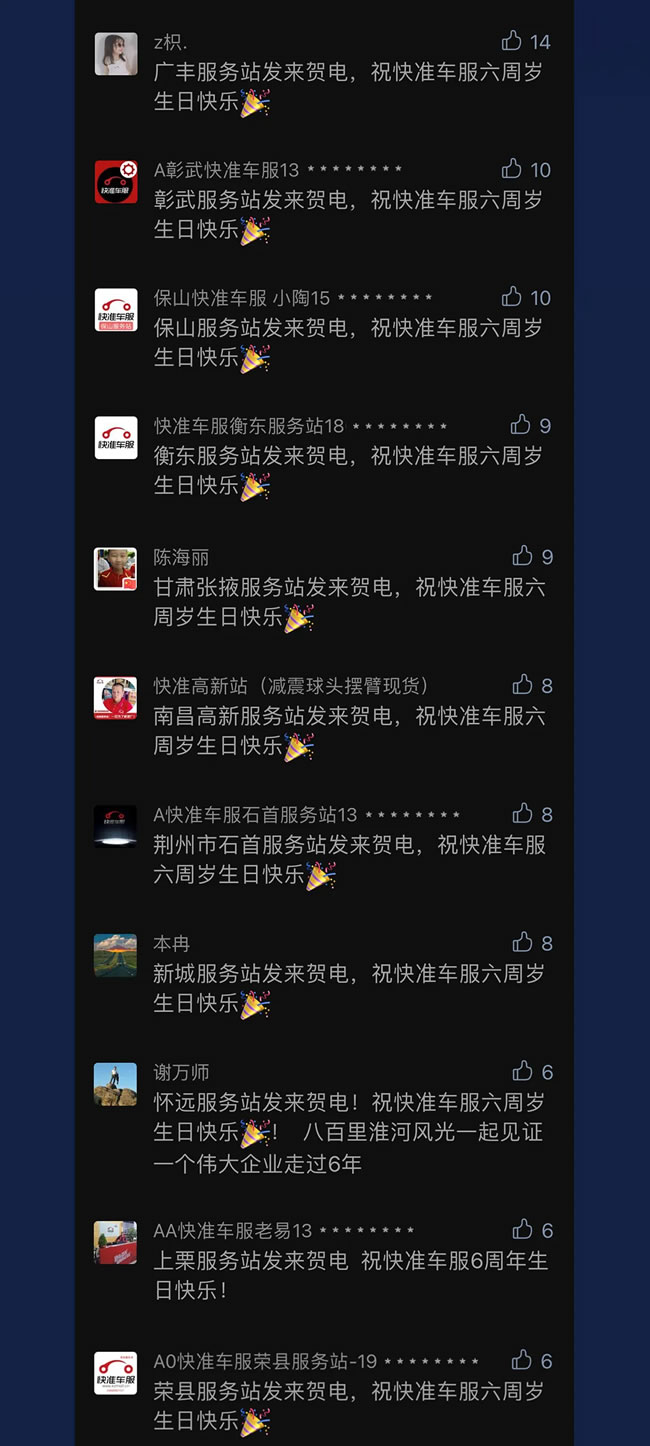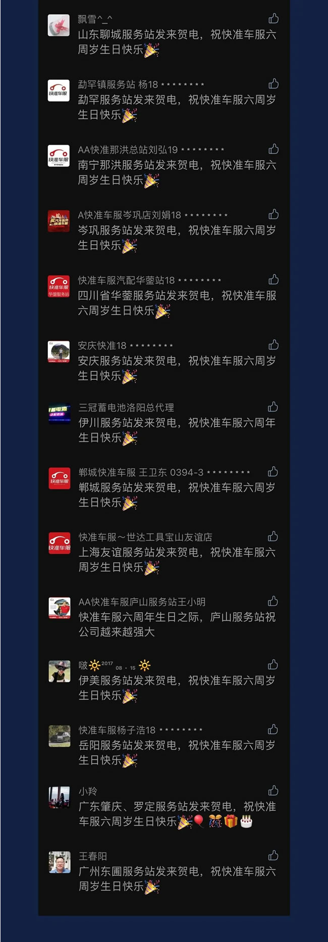 8月1日,在这个所有快准人专属的节日里,公众号留言收到了来自全国各地快准服务站的6周年祝福,满屏的祝福,满满的感动。