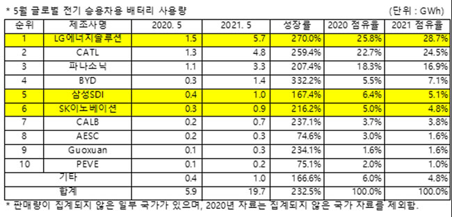 近日,韩国研究机构SNE Research发布数据显示,2021年5月,全球注册电动汽车的动力电池装机量为19.7GWh,同比增长232.5%。其中,LG新能源的动力电池装机量同比增长270%至5.7GWh,市占率升至28.7%,超越宁德时代位列第一。而宁德时代的电池装机量为4.8GWh,同比增长近260%,市场份额为24.5%,排名降至第二。