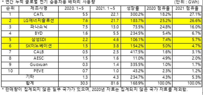 2021年1-5月,宁德时代的动力电池装机量累计为22.1GWh,市场份额为27.1%,仅以0.4GWh和0.5%市场份额的微弱优势,暂时领先于LG新能源。
