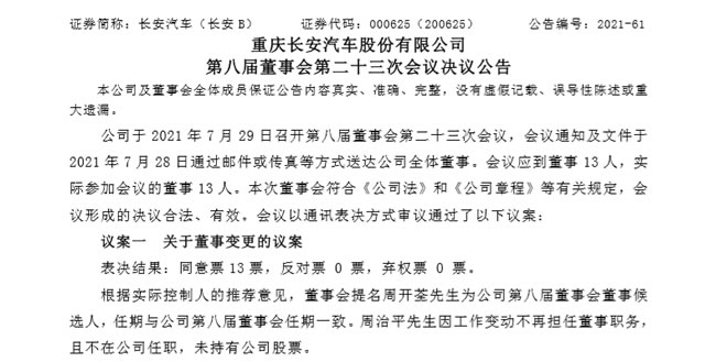 近日,长安汽车对外正式发布公告,宣布周治平不再担任董事职务;严明不再担任公司监事、监事会主席职务。提名周开荃为公司第八届董事会董事候选人,推选连健担任公司第八届监事会监事。此外,作为董事会独立董事候选人,杨新民将担任公司第八届董事会独立董事。