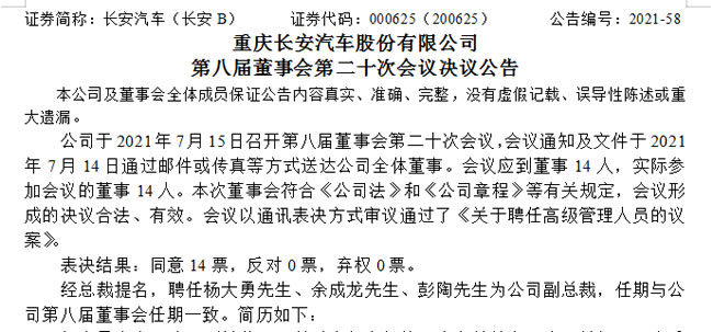 而在此之前,长安汽车还对旗下业务板块的人员也进行了相应调整。原重庆长安新能源汽车科技有限公司总经理、党委书记杨大勇;原长安汽车战略规划部总经理、党支部书记余成龙;原长安汽车乘用车营销事业部总经理、党委书记彭陶三位高管聘为公司副总裁;执行副总裁刘波因工作变动不再担任公司执行副总裁职务。对此,长安汽车官方表示,相关变动均属正常人事调动,不会对公司生产经营和日常运转造成影响。