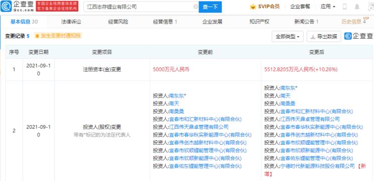 汽车之家从企查查处获悉,近日,江西志存锂业有限公司发生工商变更,新增股东宁德时代,同时公司注册资本由5000万元人民币增加至5512.82万元人民币,增幅10.26%。