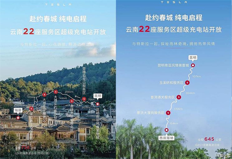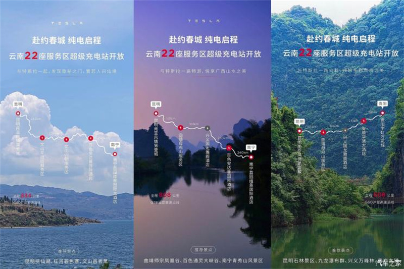 以昆明为核心,特斯拉超级充电站沿着银昆、杭瑞(昆明以东段)、沪昆、汕昆、广昆、大丽、杭瑞(昆明以西段)、昆磨8条自驾线路铺开,对内连接16个行政区,布局全线2749公里高速公路,将散落于云南超65个4A/5A级景点“明珠”,串联成璀璨的旅游线路。