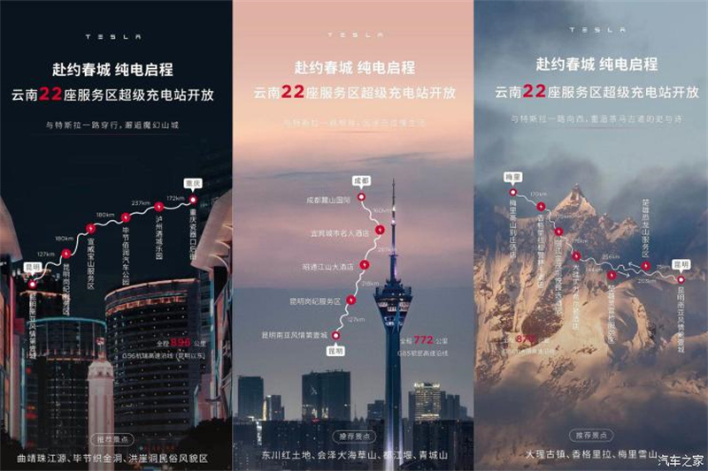 截至目前,特斯拉在云南省设置了34座超级充电站、144个超级充电桩,同时配备29座目的地充电站、70个目的地充电桩。而在全国范围内,特斯拉已经建设开通超过900座特斯拉超级充电站、7000多个超级充电桩,以及700多座目的地充电站、1730多个目的地充电桩,全面覆盖全国330多个城市。