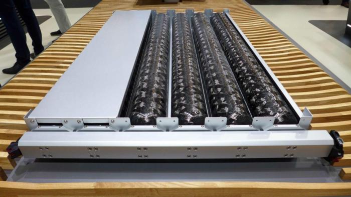 佛吉亚设计了一种双能源解决方案,可作为全电动电池配置被放入同样大小的容纳空间中,此图显示的是4个12.5L的储氢罐(图片来自JEC)