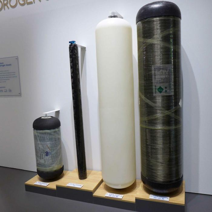 佛吉亚展台上展示了不同的储氢罐,从左至右分别是:用于乘用车的52L和12.5L储氢罐、用于大巴、货车和火车的237L内胆和储氢罐(图片来自JEC)