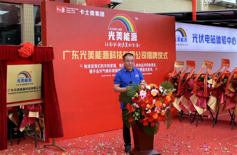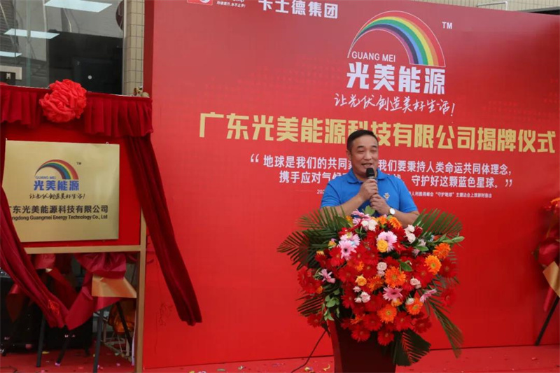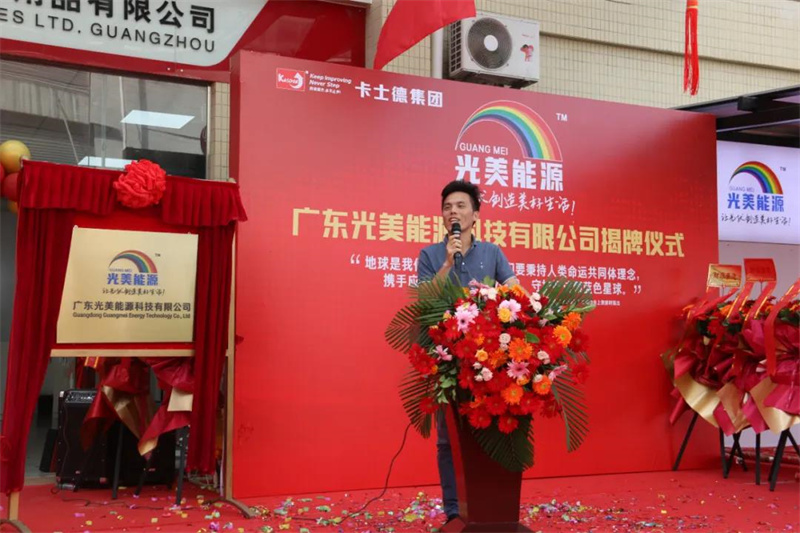 2021年10月16日上午,在卡士德广州总部举行了光美能源揭牌仪式。东莞市融海实业投资有限公司董事长熊明辉先生,晶澳太阳能科技有限公司华南区销售经理徐金明先生,光美能源总工程师兼副总经理田喜传先生等领导出席了揭牌仪式。