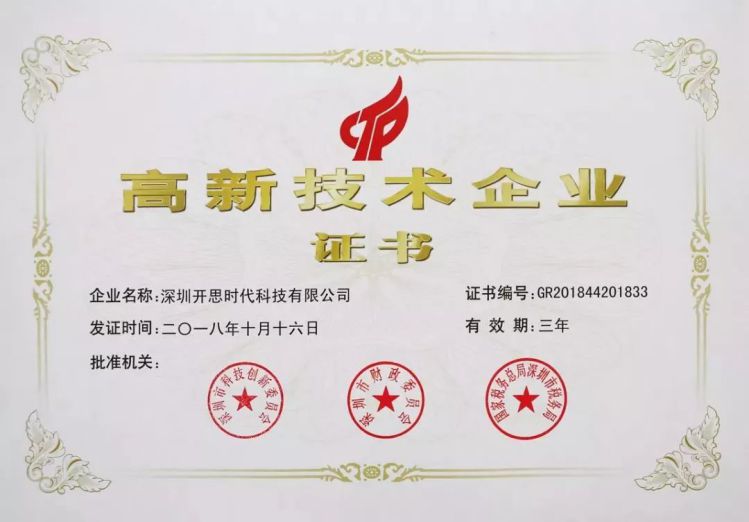 深圳开思时代科技有限公司凭借过硬的研发实力和创新能力,历经层层把关审核,荣获由深圳市科技创新委员会、深圳市财政委员会、国家税务总局深圳市税务局联合颁发的“国家高新技术企业”认证。