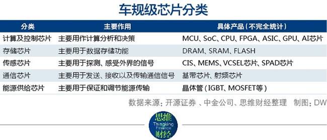 开源证券在研究报告中,按照半导体在智能汽车上具体的应用领域,将汽车芯片分为了计算及控制芯片、存储芯片、传感芯片、通信芯片和能源供给芯片五大类。