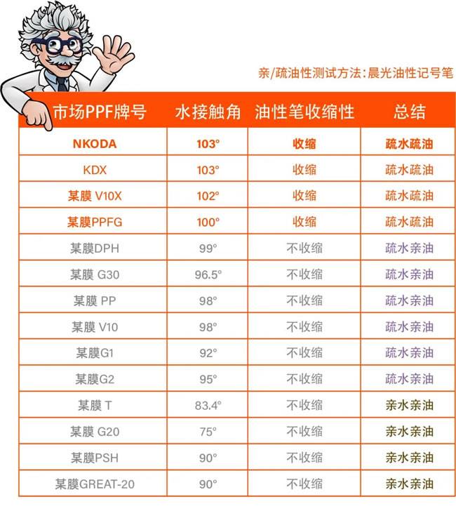 超亲水型涂层的表面带有极性基团的分子,水分极易吸附在膜表面,可以排斥油性污染物,但是需要构建水接触角<10°才能起到达到理想的效果。而目前市面上的亲水隐形车衣水接触角最低也就做到75°,大多是在80°-85°,因此油污还是会残留在车衣表面。