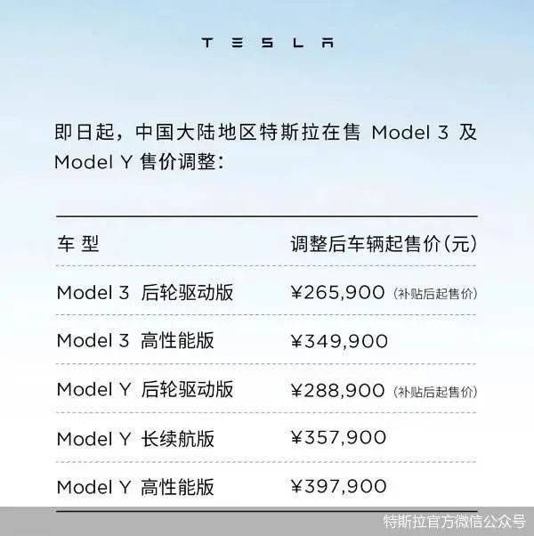10月24日,特斯拉官方宣布,即日起,将对旗下中国大陆地区在售的Model 3及Model Y售价进行调价。调整后Model 3车型起售价为265900元人民币;特斯拉Model Y车型起售价为288900元人民币(均为补贴后起售价)。