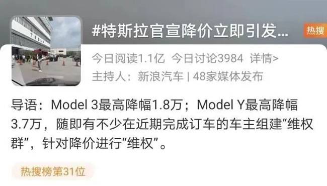 在新浪微博上,#特斯拉官宣降价立即引发维权#的话题已经冲上热搜,10月24日当晚的热度仍在不断上升。