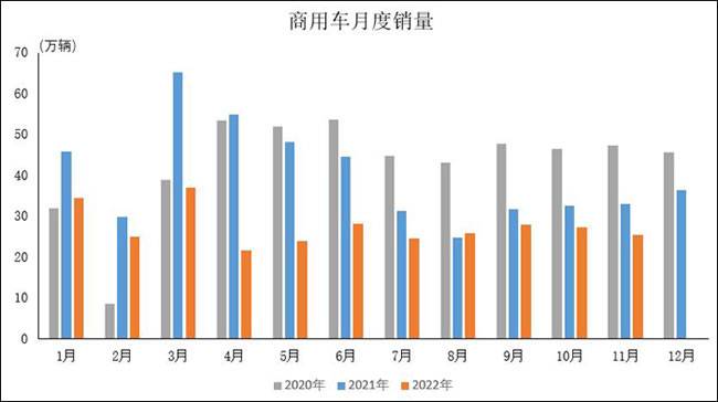 2022年11月,商用车产销分别完成23.5万辆和25.3万辆,环比分别下降11.2%和7.5%,同比分别下降33.4%和23.4%。