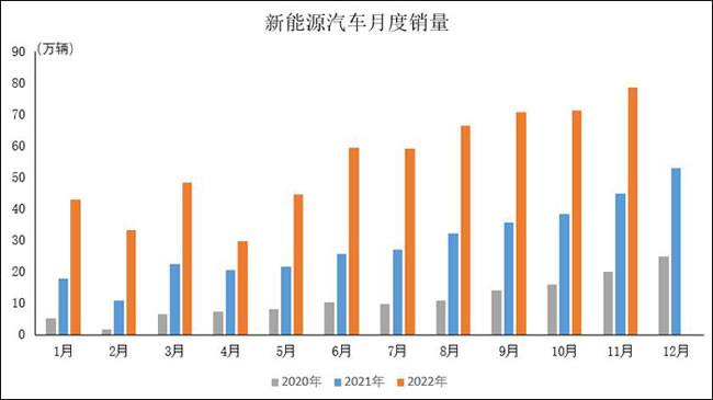 2022年11月,新能源汽车产销分别完成76.8万辆和78.6万辆,同比分别增长65.6%和72.3%。