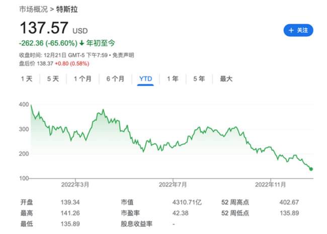 股市方面,截至本周三收盘,特斯拉股价跌至137.57美元,创下两年来的最低点。上周,特斯拉股价遭遇了自2020年以来最糟糕的一周,特斯拉的市值自2020年以来首次跌至埃克森美孚之下。