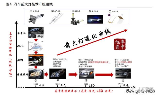 (3)持续长-空间广,产品持续升级:车灯目前经历了从卤素-氙气-LED的产品升级,未来更智能的矩阵式ADB大灯、DLP大灯是发展方向,升级过程中,单车价值量持续提升(大灯LED化过程,全套车灯从1600元到3000 元)。汽车车灯在前照大灯、后尾灯(分离式-贯穿式)、氛围灯(前格栅灯、星环灯等)等各领域,均存在较大的技术升级空间,光、电等前沿领域在汽车车灯上的应用相对具备较大的空间。