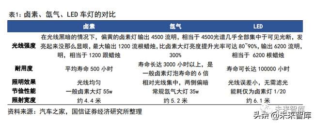 ①卤素灯:其发光原理跟白炽灯相似,但亮度比白炽灯要高,且工艺简单、制造成本低廉,但发光效率不高、照射距离短。目前国内低端车型中卤素灯占据了市场大部分份额,但在逐年缩减。卤素灯沿用传统白炽灯发光原理,由于白炽灯技术简单且发展较为成熟,卤素车灯的光源成本较为低廉,目前市面上更换一只卤素灯泡的价格约在十几元-几十元不等。②氙气灯:起于20世纪90年代欧洲,特点是发射光多,能效高,具有比较高的能量密度和光照强度,使用寿命比卤素灯长得多。氙气灯必须搭配高压触发器使用,同时整体安装难度较高,需要进行各种的色温匹配,性价比一般。③LED灯:LED车灯是指采用LED(发光二极管)为光源的车灯。因为LED具有亮度高、颜色种类丰富、低功耗、寿命长的特点,LED被广泛应用于汽车领域。LED在车用仪表盘、背光照明开关、汽车阅读灯或抬头显示系统等汽车内部的应用较为成熟,其中仪表盘的背光已经100%使用LED。在汽车外部,例如汽车组合尾灯、刹车灯等小灯领域也已采用了LED。近年来LED前大灯得到了广泛应用。